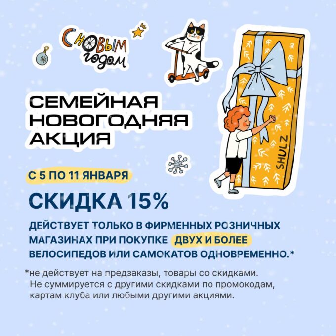 С 5 по 11 января дарим скидку 15% тем, кто покупает одновременно два и более велосипеда или самоката в офлайновых магазинах SHULZ.